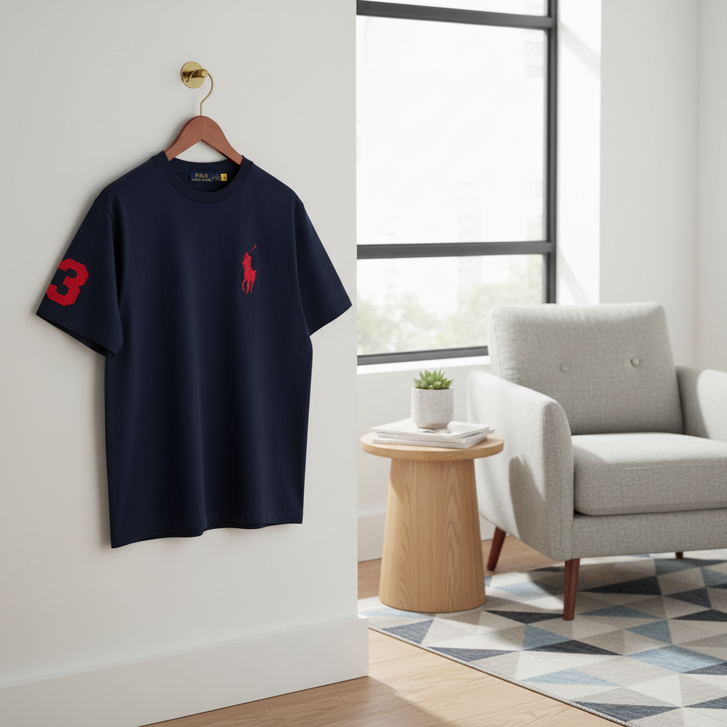 Ralph Lauren navy blue cotton T-shirt, soft and breathable fabric, red Polo logo on chest, red number 3 on sleeve, classic crew neck, unisex casual style with timeless American elegance.
