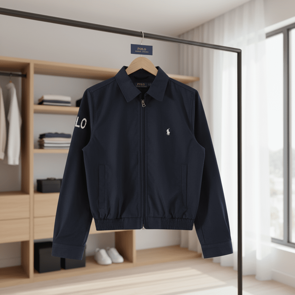 Ralph Lauren classic navy jacket with iconic pony logo on chest and POLO lettering on sleeve, soft fabric, zip closure, elastic hem, unisex casual design perfect for everyday wear.