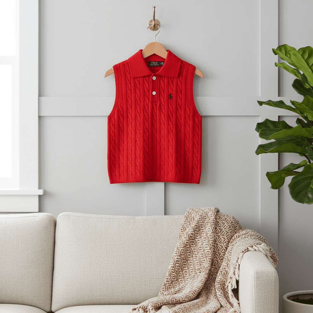 Ralph Lauren Classic Polo Red Sleeveless Knit Vest, premium fabric, polo collar with button placket, signature pony logo, unisex casual style, breathable, elegant and perfect for spring or fall.