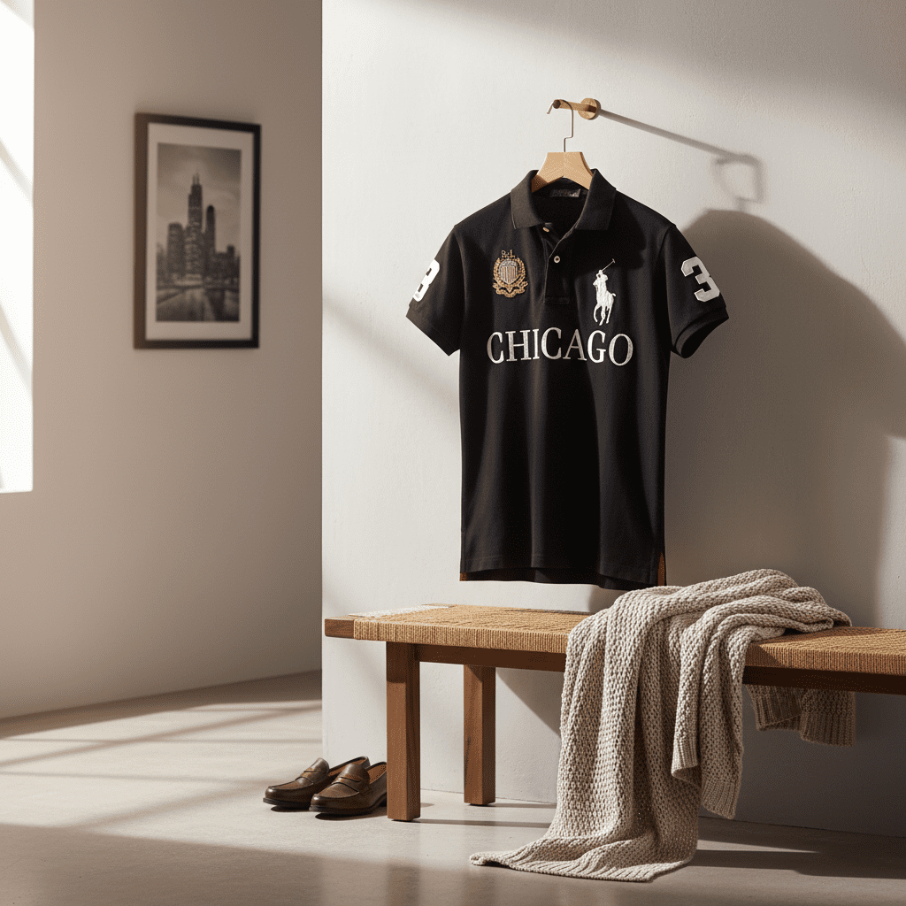 Ralph Lauren black cotton Polo shirt, soft and breathable, features bold white “CHICAGO” print, crest emblem, signature polo logo, sleeve number detail, unisex casual style for everyday wear.