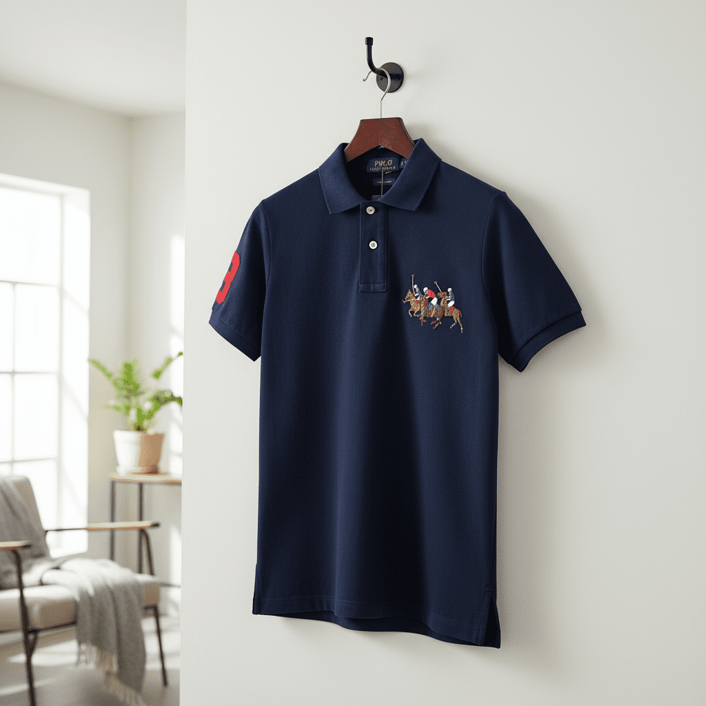 Ralph Lauren Classic Navy Polo Shirt made of soft breathable cotton, featuring iconic polo embroidery on chest and red number 3 on sleeve, timeless collar design, unisex casual style for daily wear.