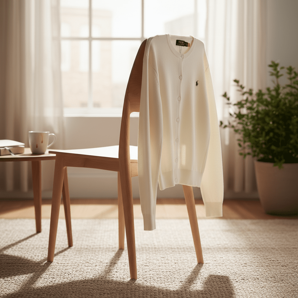 Ralph Lauren classic white knit cardigan, featuring soft breathable fabric, crew neck, button-down design, signature pony logo on chest, unisex, perfect for daily work or casual style.
