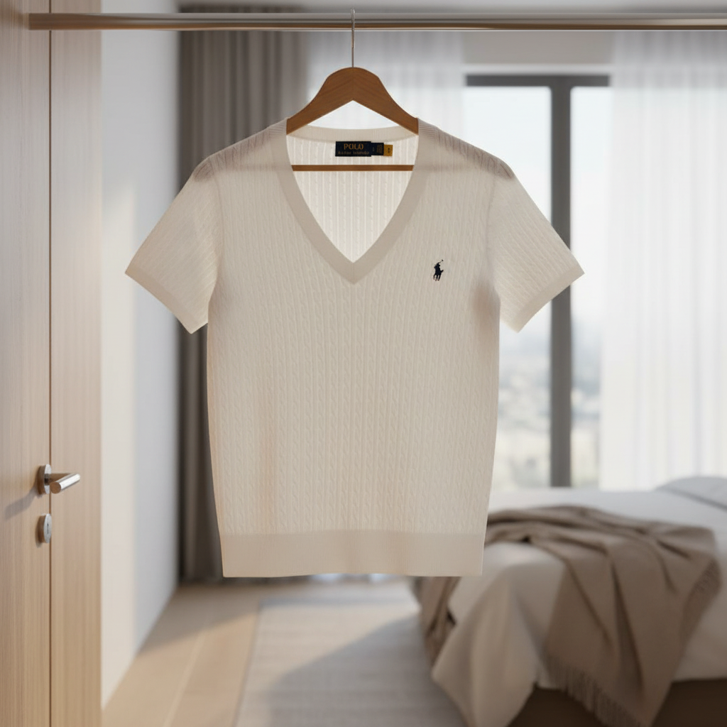 Ralph Lauren POLO White V-Neck Short Sleeve Knit Sweater, soft breathable fabric, classic pony logo on chest, simple and elegant American casual style, unisex, perfect for everyday wear.