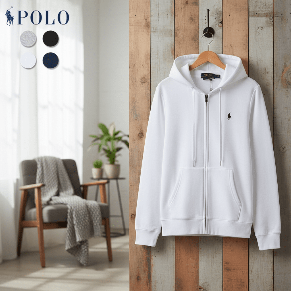 Ralph Lauren POLO White Zip Hoodie, premium cotton fabric, drawstring hood, iconic pony logo on chest, kangaroo pocket, unisex classic design, cozy & stylish American casual wear.