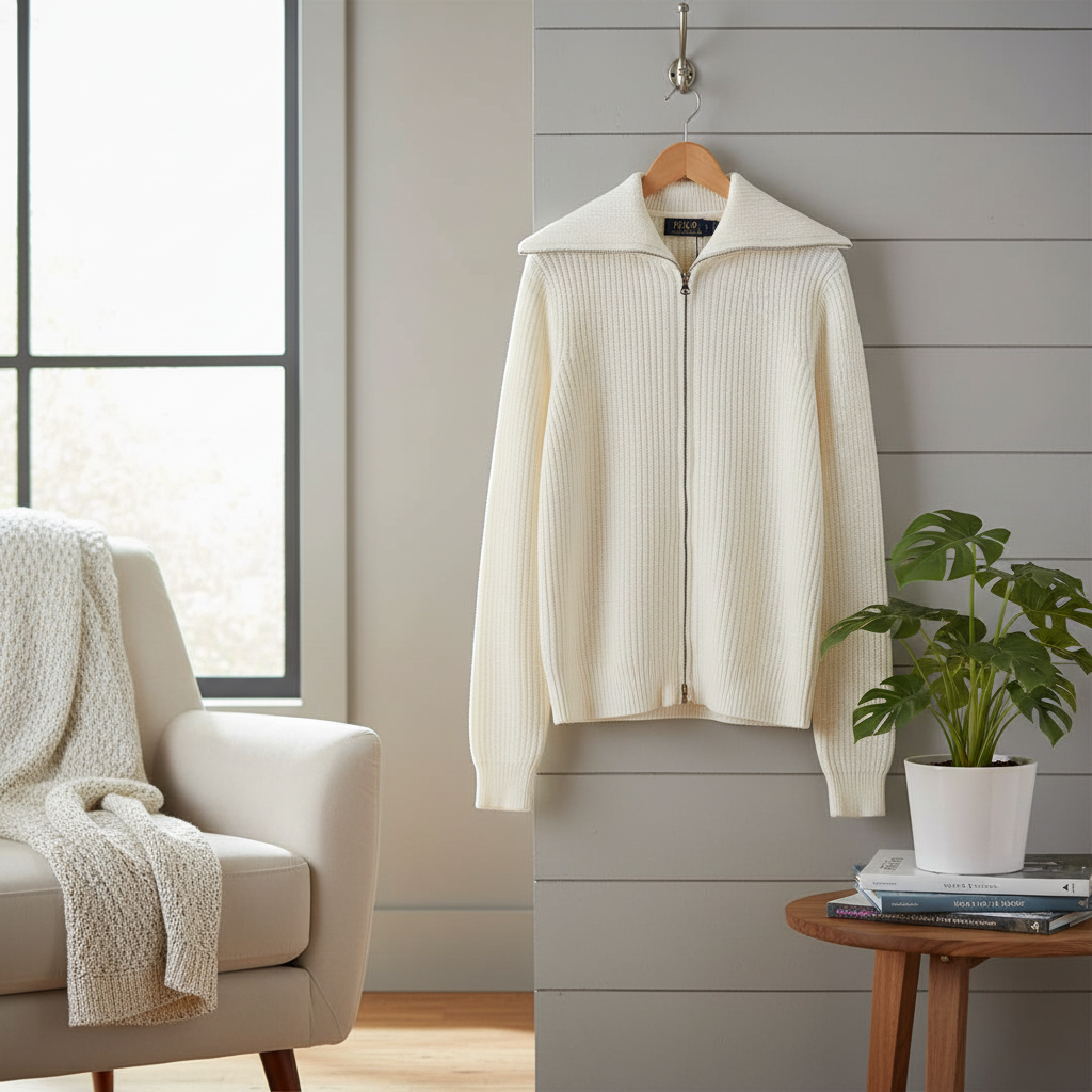 Ralph Lauren white ribbed knit zip sweater, made from soft comfortable fabric with wide collar design, unisex casual style, perfect for daily wear, versatile and effortlessly chic.