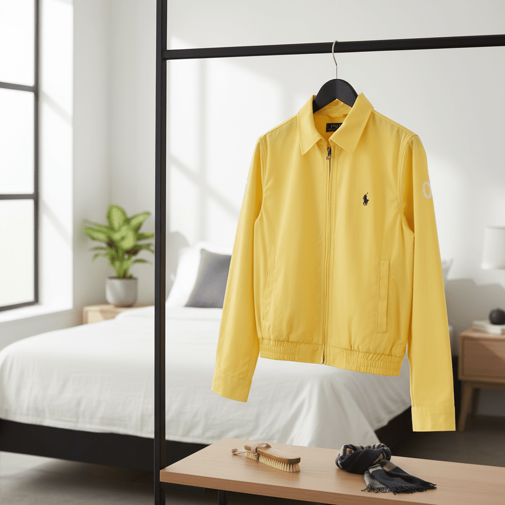 Ralph Lauren Polo Yellow Casual Jacket, made from premium soft fabric, features a classic collar and zipper design, iconic pony logo on chest, sleeve branding, unisex style for daily casual wear.