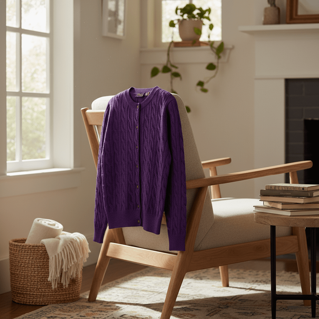 Ralph Lauren POLO Purple Cable Knit Cardigan, soft and cozy texture, round neck with button closure, classic pony logo on chest, unisex vintage American casual style, perfect for everyday wear.