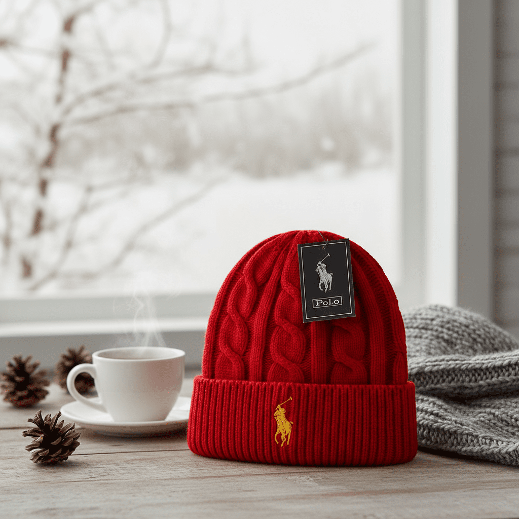 Ralph Lauren Classic Red Knit Beanie, made from premium warm fabric with cable pattern, iconic polo logo, unisex casual style, soft and stylish winter hat for comfort and fashion.