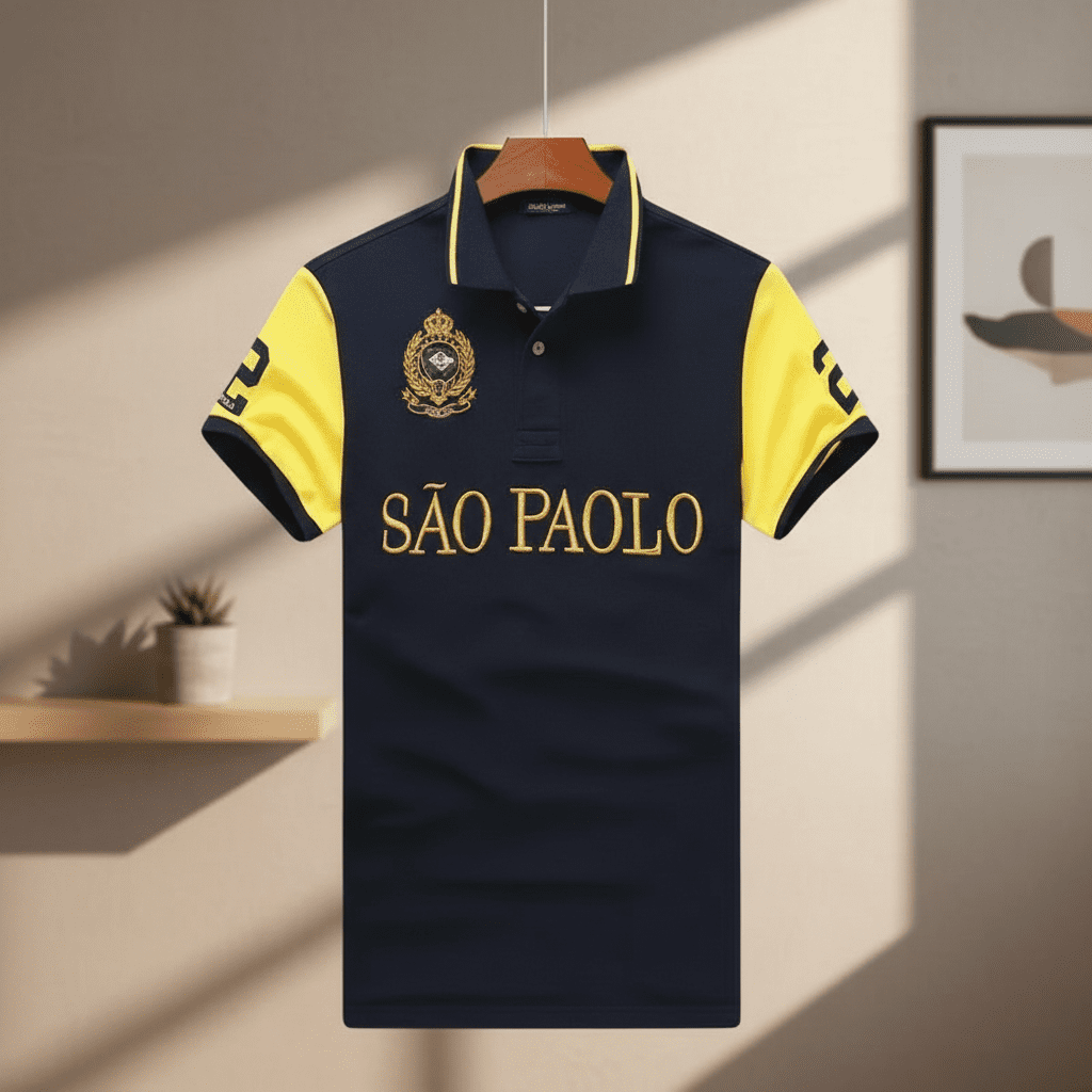 Ralph Lauren SÃO PAOLO Polo Shirt, navy and yellow colorblock design, soft breathable cotton, gold crest and lettering, sporty sleeve numbers, unisex style for casual and athletic elegance.