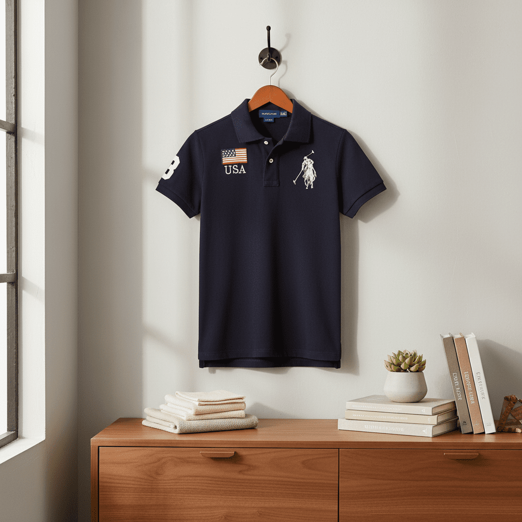 Ralph Lauren navy blue polo shirt made of premium soft cotton, featuring USA flag embroidery and iconic polo player logo, unisex design for casual everyday wear with timeless American style.