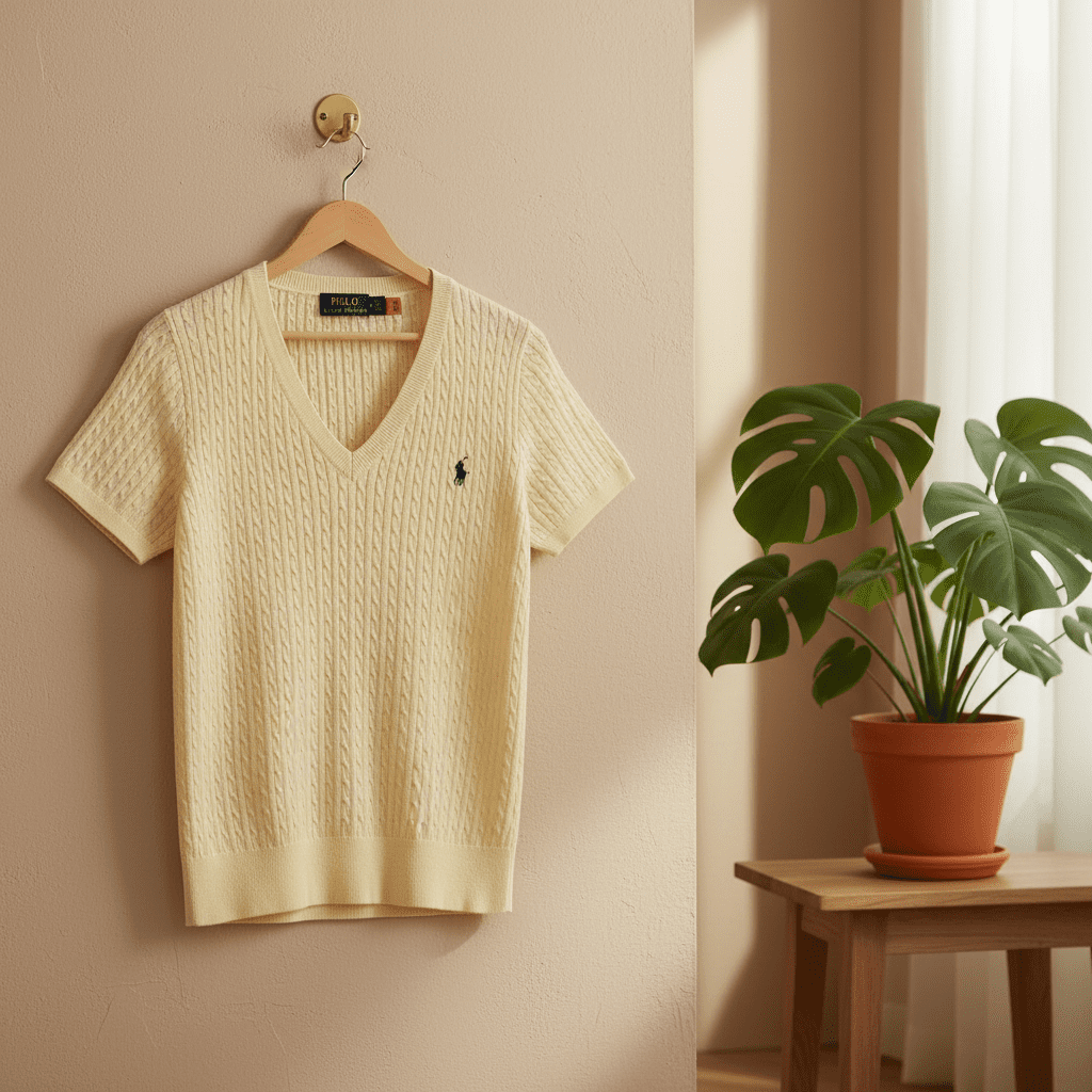 Ralph Lauren Polo ivory V-neck short sleeve knit sweater, soft textured fabric, iconic pony logo on chest, minimalist design for everyday casual style, unisex fit, embodying classic American elegance.