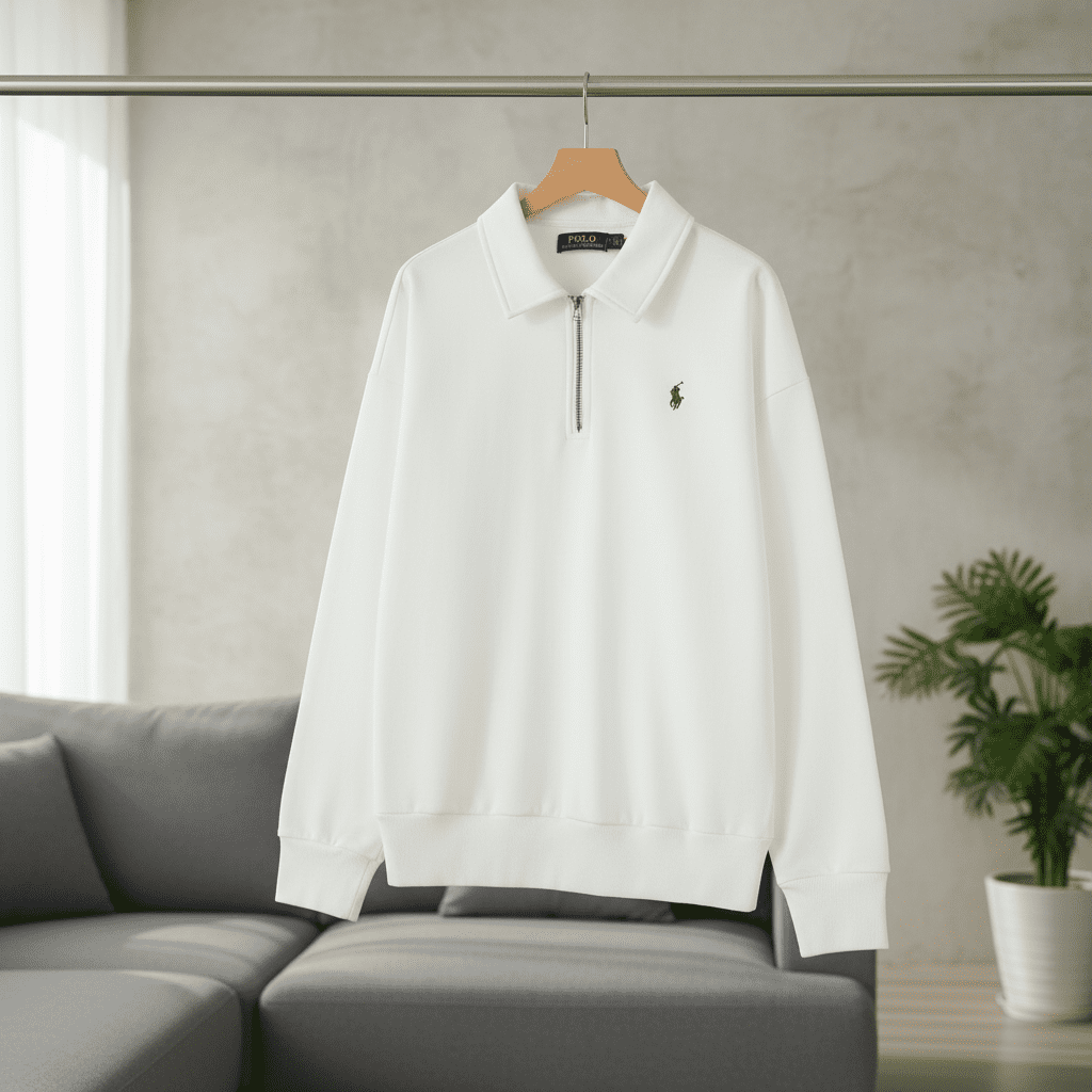 Ralph Lauren Polo White Half-Zip Sweatshirt made from premium breathable cotton, classic polo collar design, iconic pony logo on chest, unisex American casual style with timeless elegance.