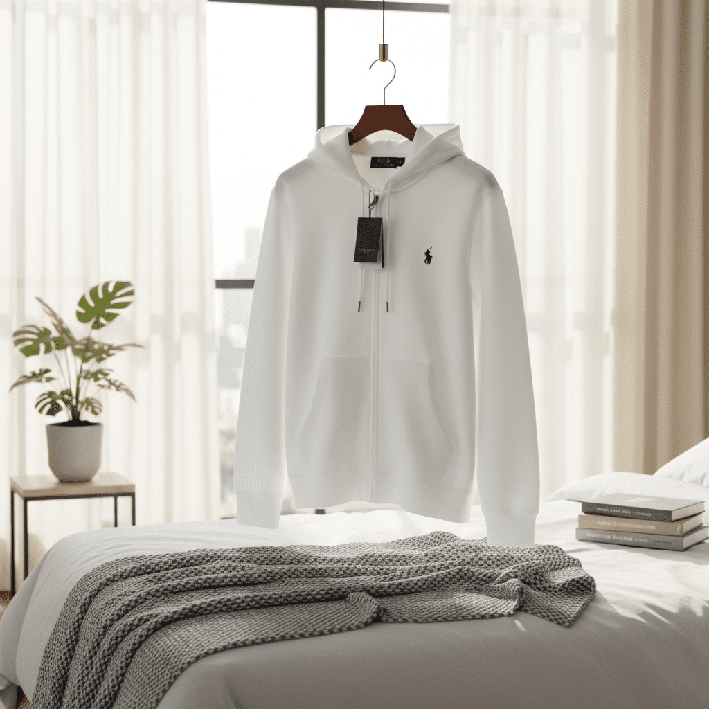 Ralph Lauren White Full-Zip Hoodie crafted from premium soft cotton. Features signature black pony logo on chest, zip closure, and hooded unisex design for timeless American casual style.