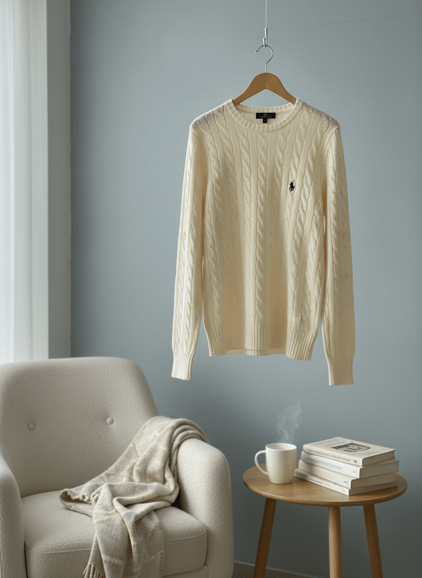 Ralph Lauren classic cream cable-knit sweater, soft and warm fabric with iconic pony logo, crewneck design, unisex American casual style, elegant and timeless for everyday wear.