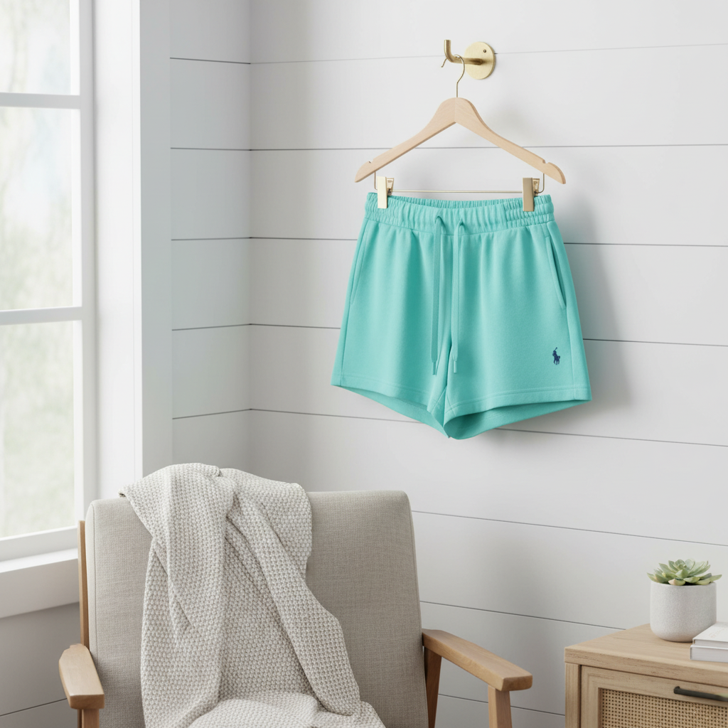 Ralph Lauren Classic Mint Green Cotton Shorts for Women, soft breathable fabric, adjustable drawstring waist, side pockets, iconic pony logo, effortless American casual style.