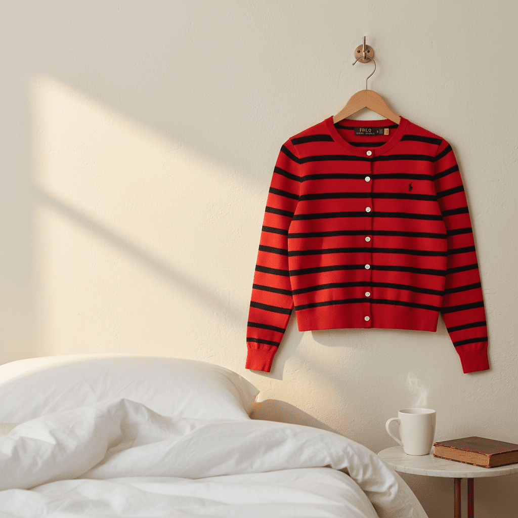 Ralph Lauren POLO red and black striped cotton cardigan, soft and breathable fabric, round neck, button front, iconic pony logo on chest, unisex casual style, comfy and stylish for everyday wear.