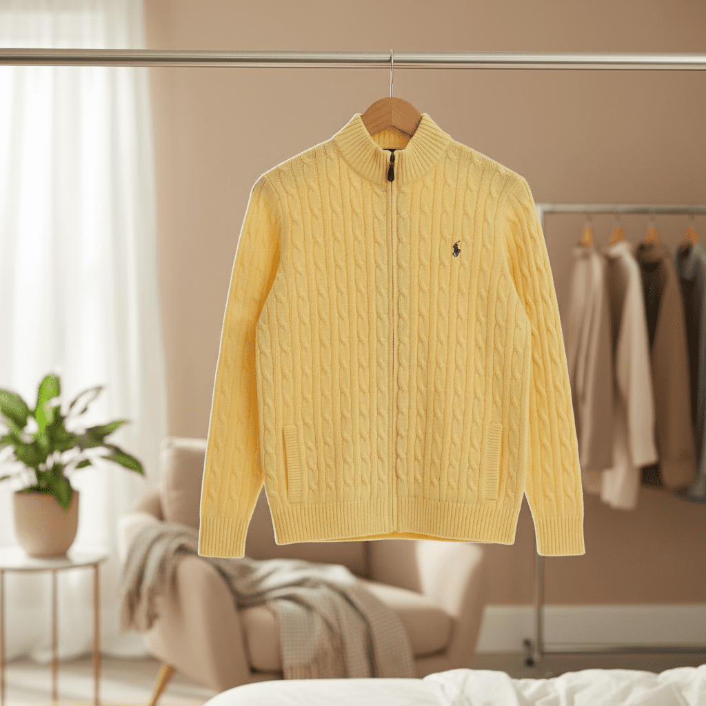 Ralph Lauren Classic Yellow Knit Cardigan, crafted from soft fabric with cable texture, zip-up stand collar, signature pony logo, side pockets, unisex style for cozy and elegant everyday wear.