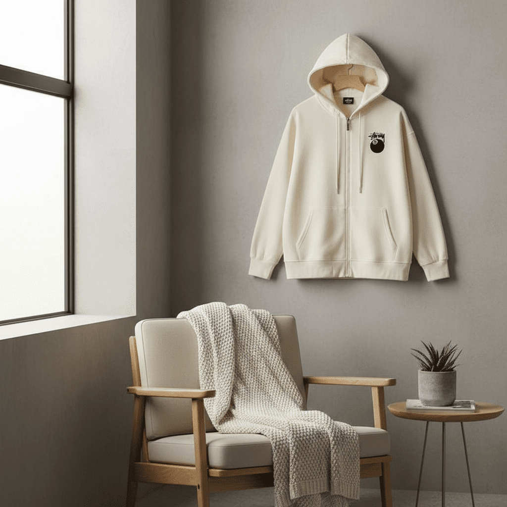 Stussy 8 Ball Series Off-white Zip Hoodie, soft cotton fabric, small 8-ball chest logo, large graffiti 8-ball back print, unisex streetwear style, easy zip design, perfect for casual daily wear.