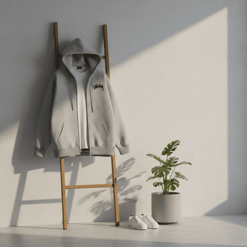 Stussy Grey Zip Hoodie, made from soft breathable cotton. Features classic logo on chest, bold black 8-ball graphic on back, adjustable hood, unisex design for effortless street style.
