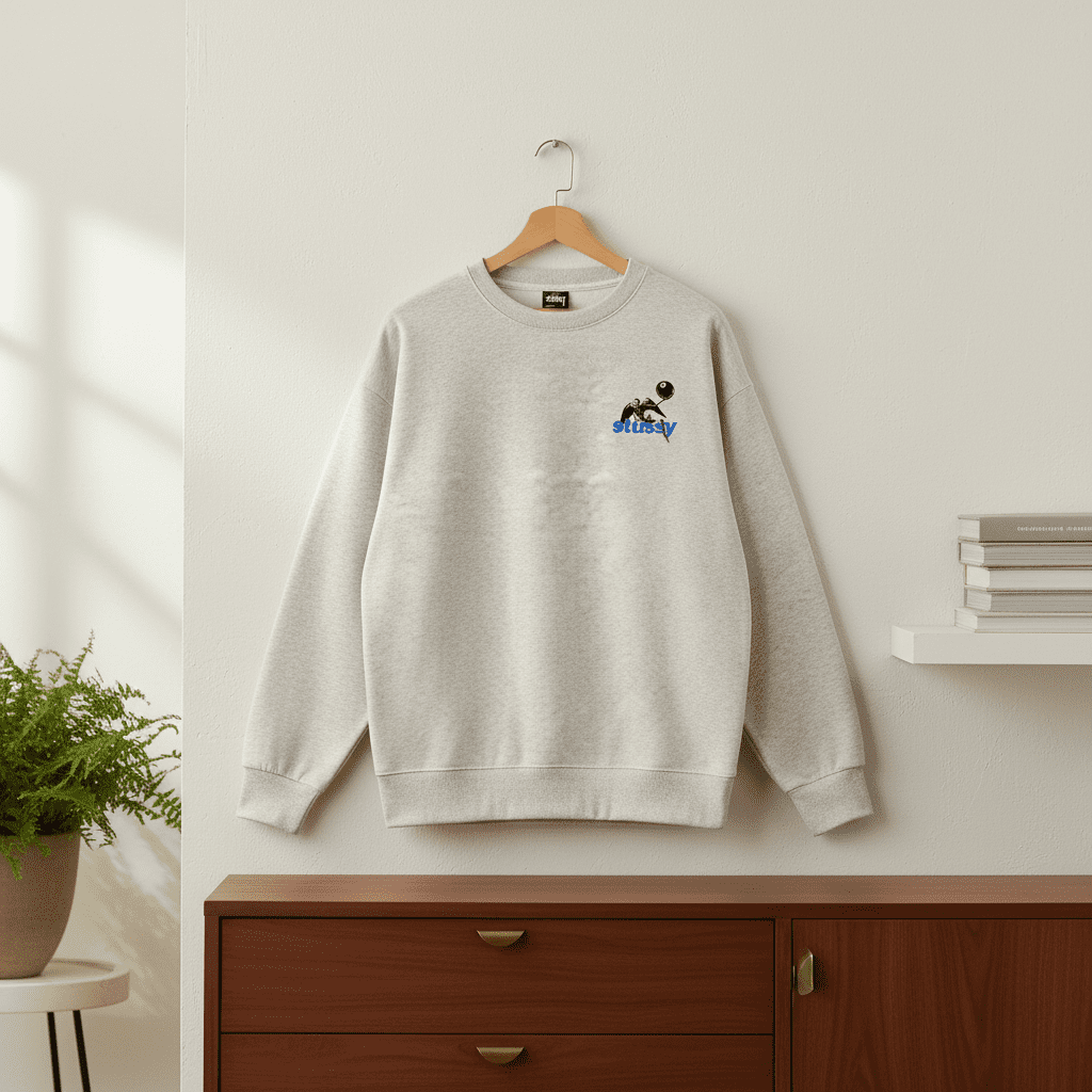 Stussy Light Grey Crewneck Sweatshirt, soft breathable cotton, skull and 8-ball graphic on front and back, blue logo print, unisex streetwear style for casual daily outfits.