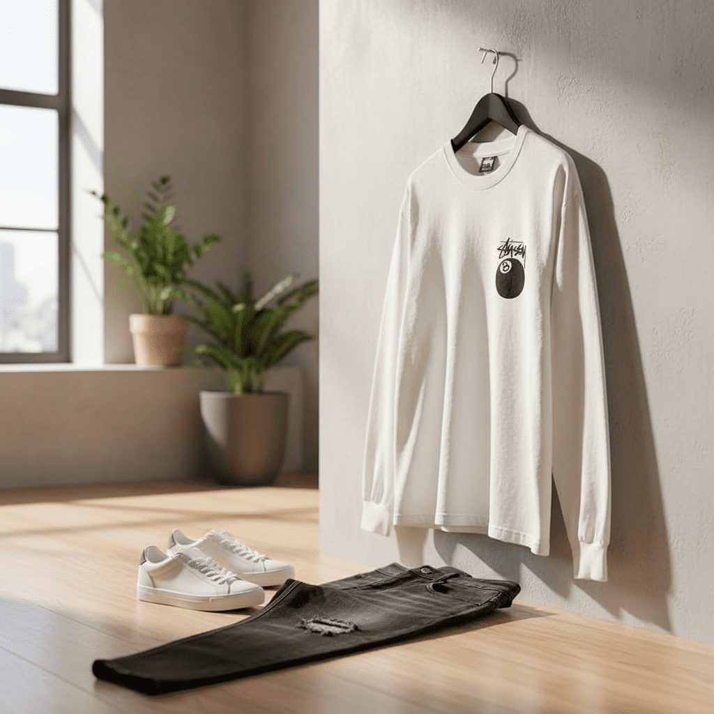 Stussy White Long Sleeve T-Shirt features soft cotton fabric, front 8-ball logo with brand print, bold graffiti-style back design, unisex streetwear for daily casual style and individuality.