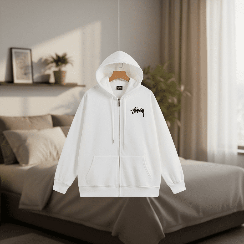 Stussy White Zip Hoodie features soft breathable cotton, classic Stussy logo on front, bold 8-ball graphic on back, streetwear unisex style, casual and comfortable for everyday wear.