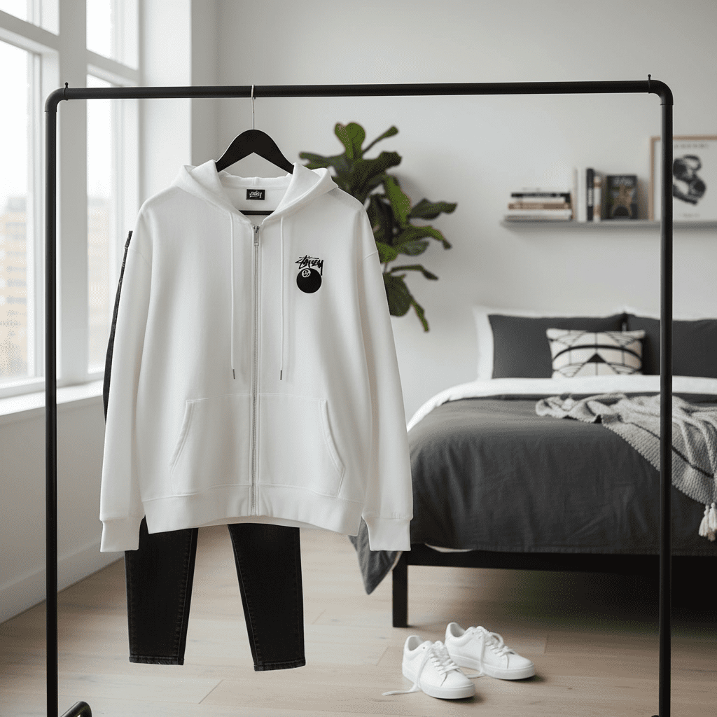 Stussy white zip-up hoodie, soft breathable cotton, front small 8-ball graphic, back large 8-ball with signature logo, drawstring hood, kangaroo pocket, unisex streetwear style for daily casual looks.
