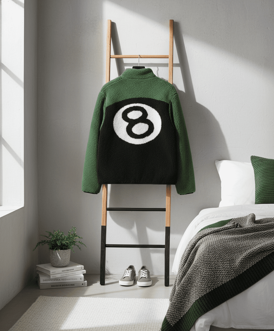 Stussy Green Sherpa Fleece Jacket with 8 Ball Design, warm and soft material, unisex streetwear style, unique contrast color, cozy fit, perfect for winter fashion and urban looks.