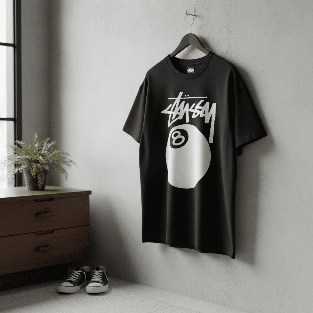 Stussy black cotton T-shirt with soft breathable fabric, iconic graffiti logo and 8-ball graphic on back; streetwear style for men and women, perfect for casual daily wear.