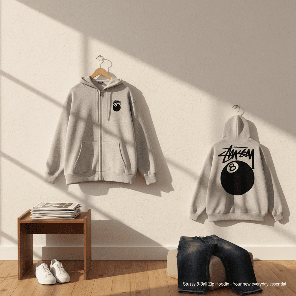 Stussy Light Gray 8 Ball Zip Hoodie, soft cotton fabric for comfort, small chest logo and bold back print, unisex streetwear style, warm and casual for everyday fashion.