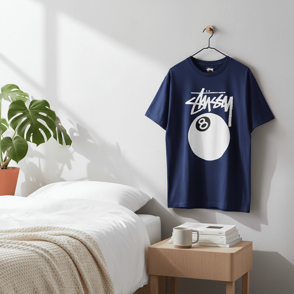 Stussy 8 Ball Series Navy Blue T-Shirt, made of premium breathable cotton, features iconic signature and 8-ball graphic on the back, unisex streetwear style perfect for casual daily outfits.