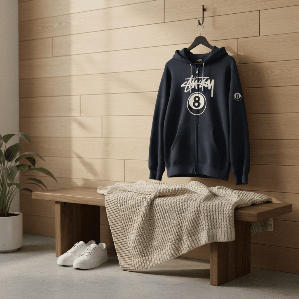 Stussy Navy Zip Hoodie made of soft breathable cotton, front logo patch, back graffiti and 8-ball print, unisex streetwear style, perfect for daily casual outfits.
