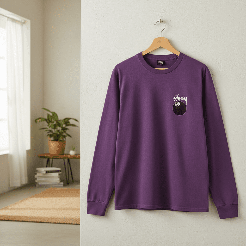 Stussy Purple Long Sleeve T-Shirt made of soft breathable cotton, featuring front mini logo with 8-ball graphic and bold back hand-drawn Stussy print, unisex streetwear for casual everyday style.