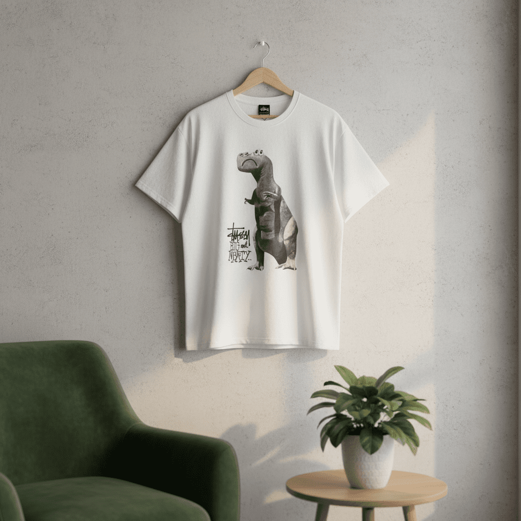 Stussy Dinosaur Graphic T-Shirt, made from soft breathable white cotton, features graffiti logo design and streetwear style. Unisex casual tee showing personality with comfort and fashion.