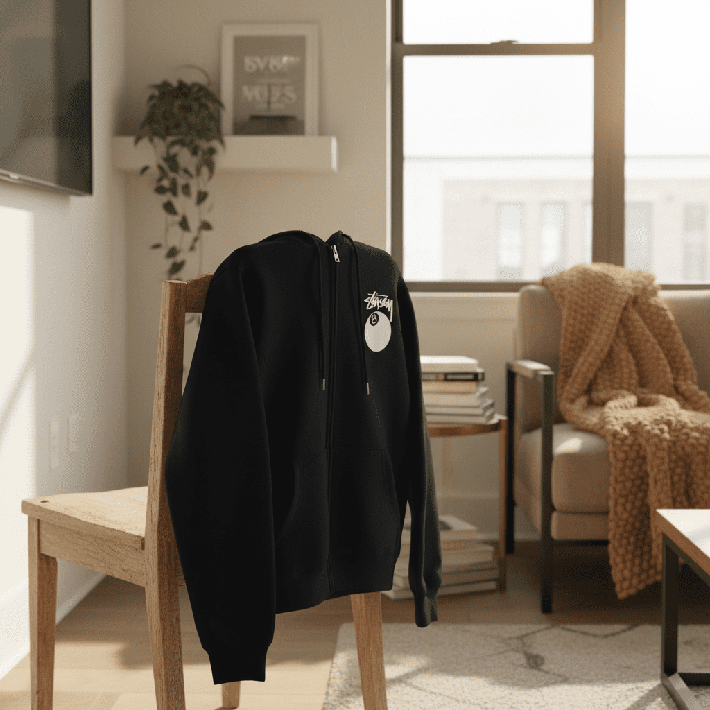 Stussy Black Zip-Up Hoodie – Soft premium cotton, classic Stussy logo with 8-ball graphic, streetwear style, drawstring hood, kangaroo pocket, unisex casual wear for everyday comfort.