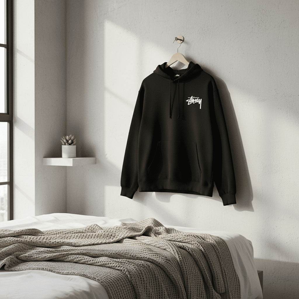 Stussy black hoodie made from premium cotton, soft and breathable with white hand-style logo on front and flaming skull poker design on back, kangaroo pocket, streetwear unisex casual style.