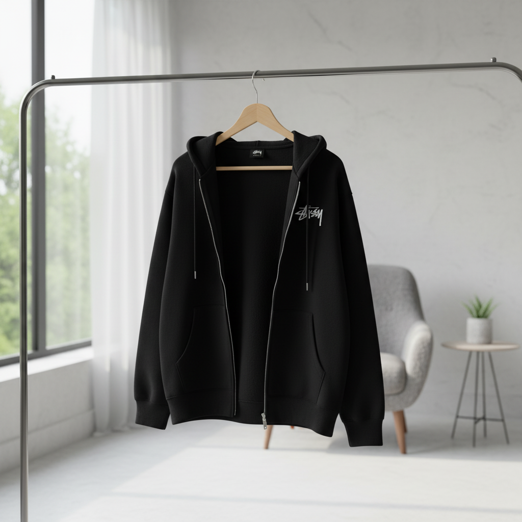Stussy Black Zip Hoodie features soft cotton fabric, classic front logo, colorful plush collage back design, drawstring hood, easy zip closure, unisex streetwear for casual everyday style.