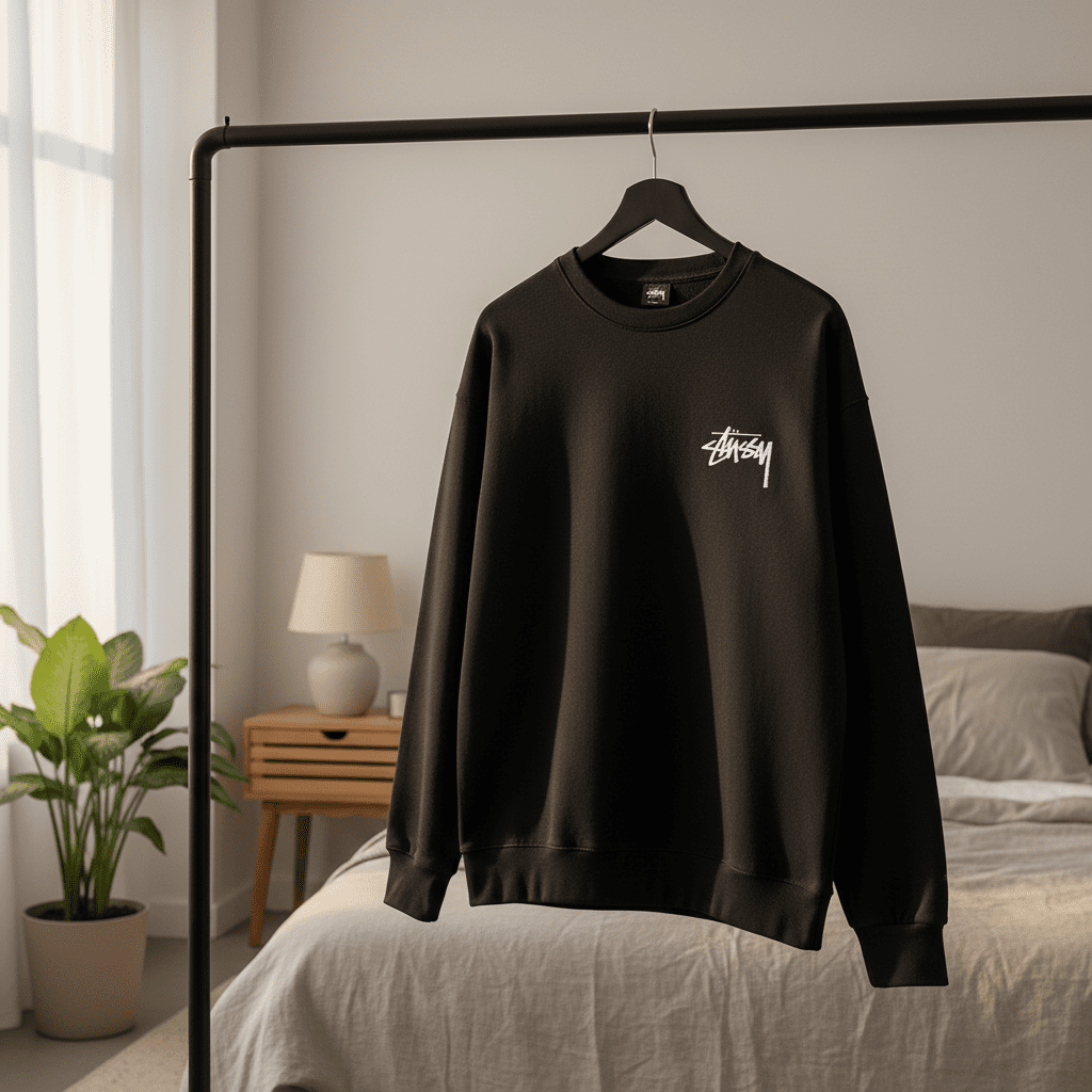 Stussy Black Crewneck Sweatshirt, soft breathable cotton, classic graffiti logo on chest, black and white graphic back design, unisex streetwear for casual stylish everyday look.