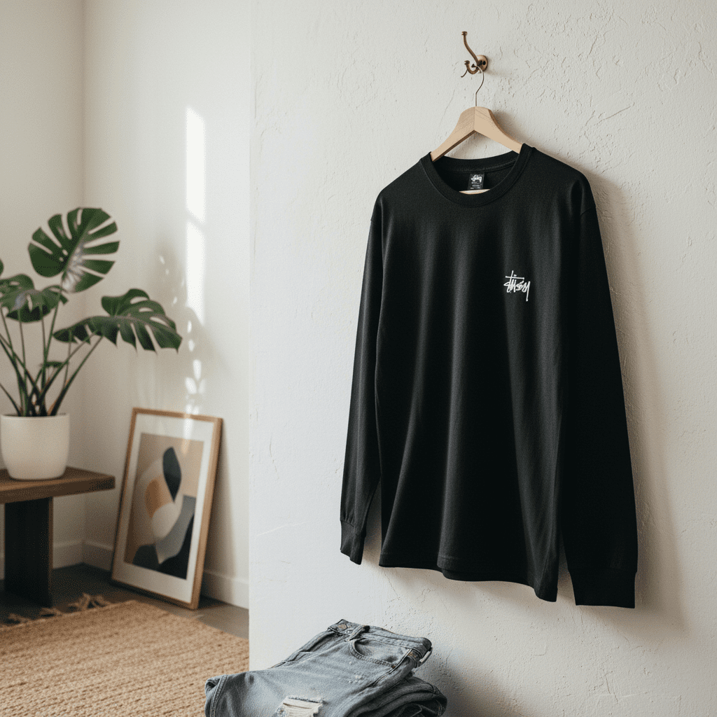 Stussy Black Long Sleeve T-Shirt, made from breathable cotton, features front logo and back graffiti print, unisex streetwear design for casual daily style and self-expression.