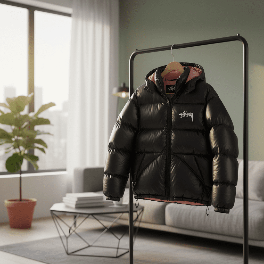 Stussy Black Glossy Down Jacket—windproof and warm material, hood with drawstring hem, white logo on front, pink contrast lining, unisex streetwear style, fashionable and functional.
