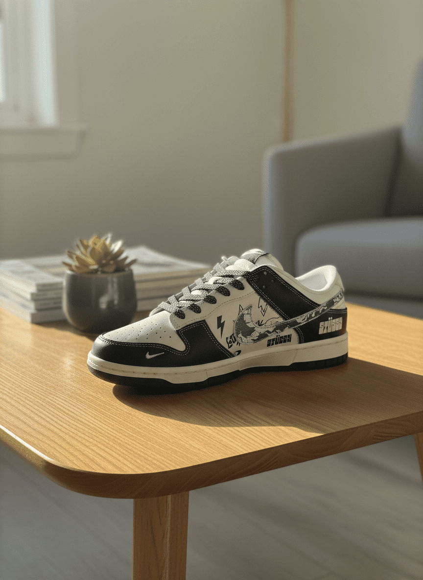 Stussy Black White Casual Sneakers crafted from premium leather and breathable mesh, featuring graffiti patterns, logo and signature details, streetwear style for men and women, comfy and stylish daily wear.