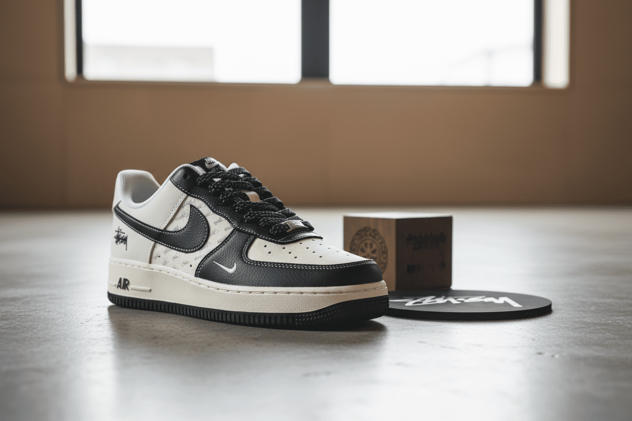 Stussy x Nike AF1 Black White Sneakers feature classic Air Force 1 design, premium breathable leather upper, Stussy logo print, black Swoosh with side signature, unisex streetwear style for everyday wear.