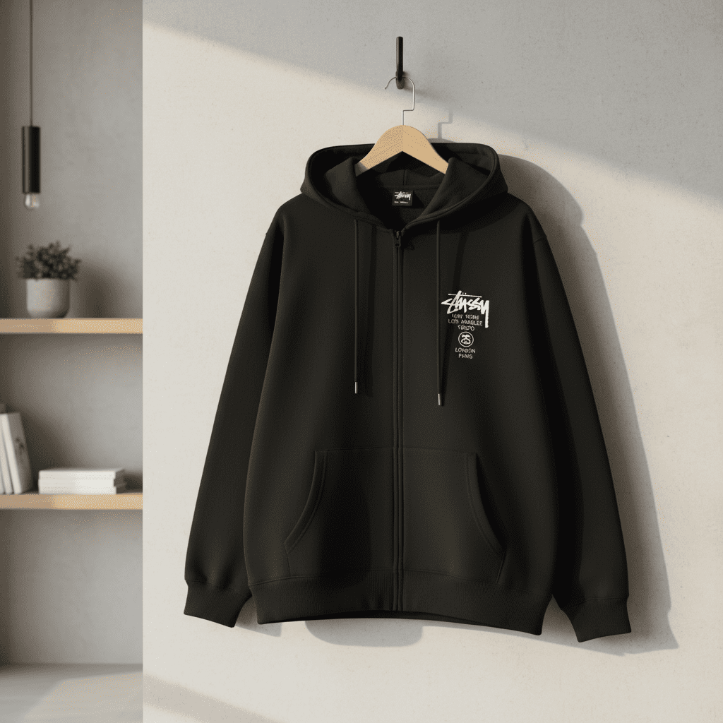 Stussy Black Zip Hoodie, made of premium cotton, features iconic graffiti logo with city prints, adjustable drawstring hood, kangaroo pocket, unisex streetwear for casual everyday style.