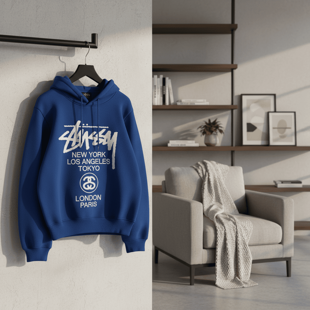 Stussy Blue Hoodie features premium soft breathable cotton, iconic handwritten Stussy logo with city prints and double S emblem, unisex streetwear style, drawstring hood for casual comfort and fashion.