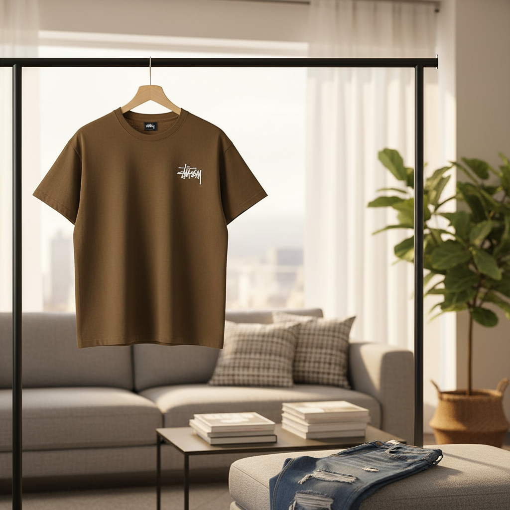 Stussy Brown Cotton T-Shirt with front graffiti logo and large back totem design, unisex streetwear style, breathable and comfy for daily casual outfits with a bold urban vibe.