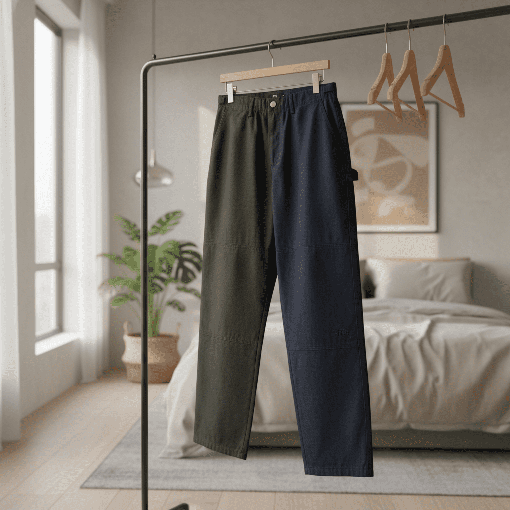 Stussy Black Cargo Pants made from premium cotton, straight-leg design with stitched panels, side logo tag, streetwear style, unisex, comfy and versatile for everyday wear.