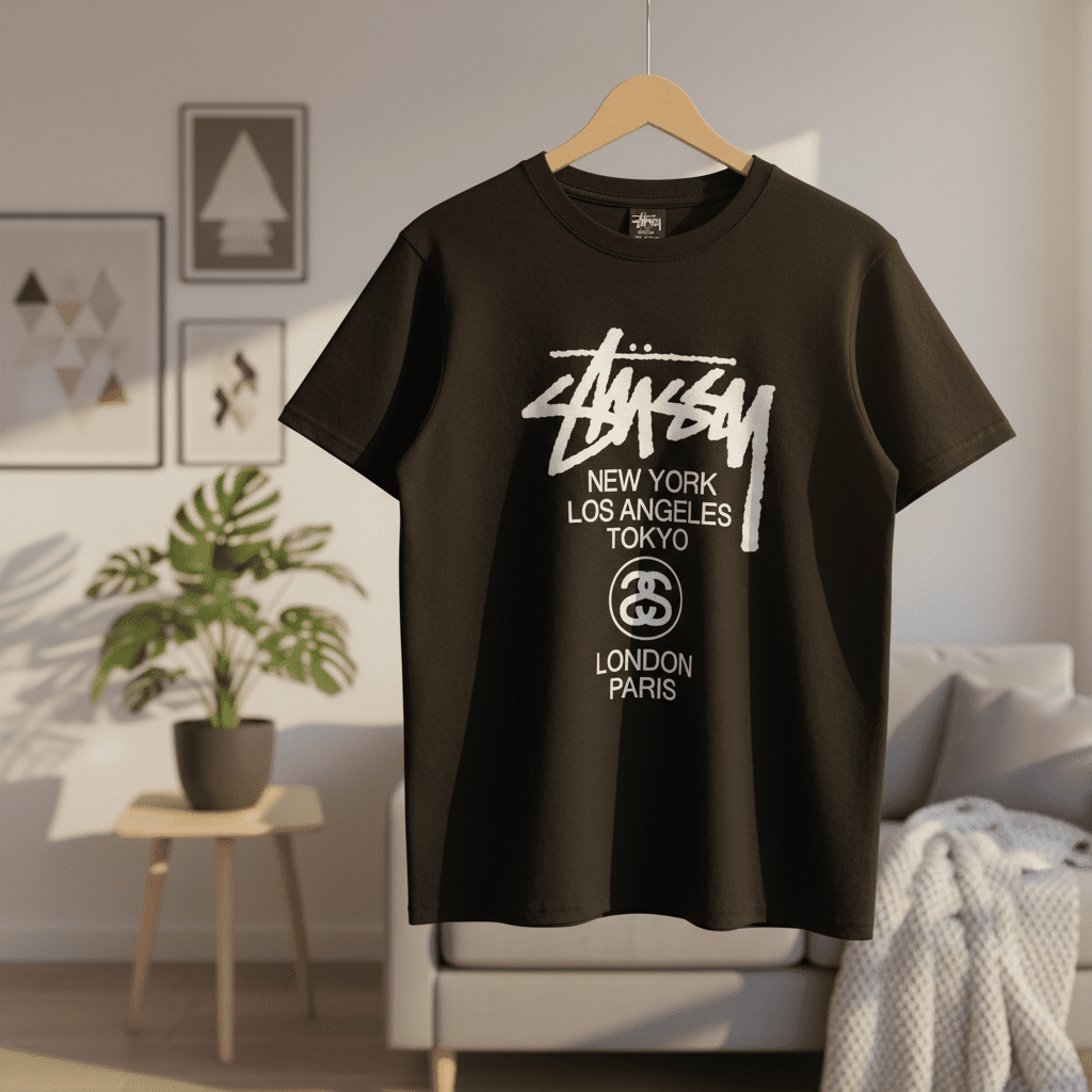 Stussy Black Street Style T-Shirt, made from premium breathable cotton. Features iconic graffiti logo, city names, and unique totem design. Unisex fit for casual, trendy everyday wear.