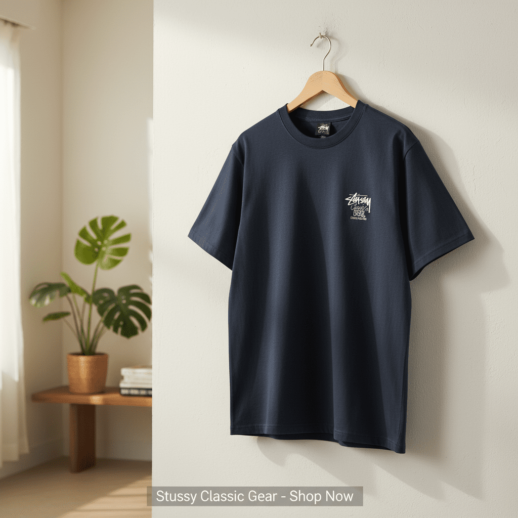 Stussy Classic Gear navy T-shirt made from soft breathable cotton, features small front logo and graffiti back print, unisex streetwear for casual style and bold brand identity.