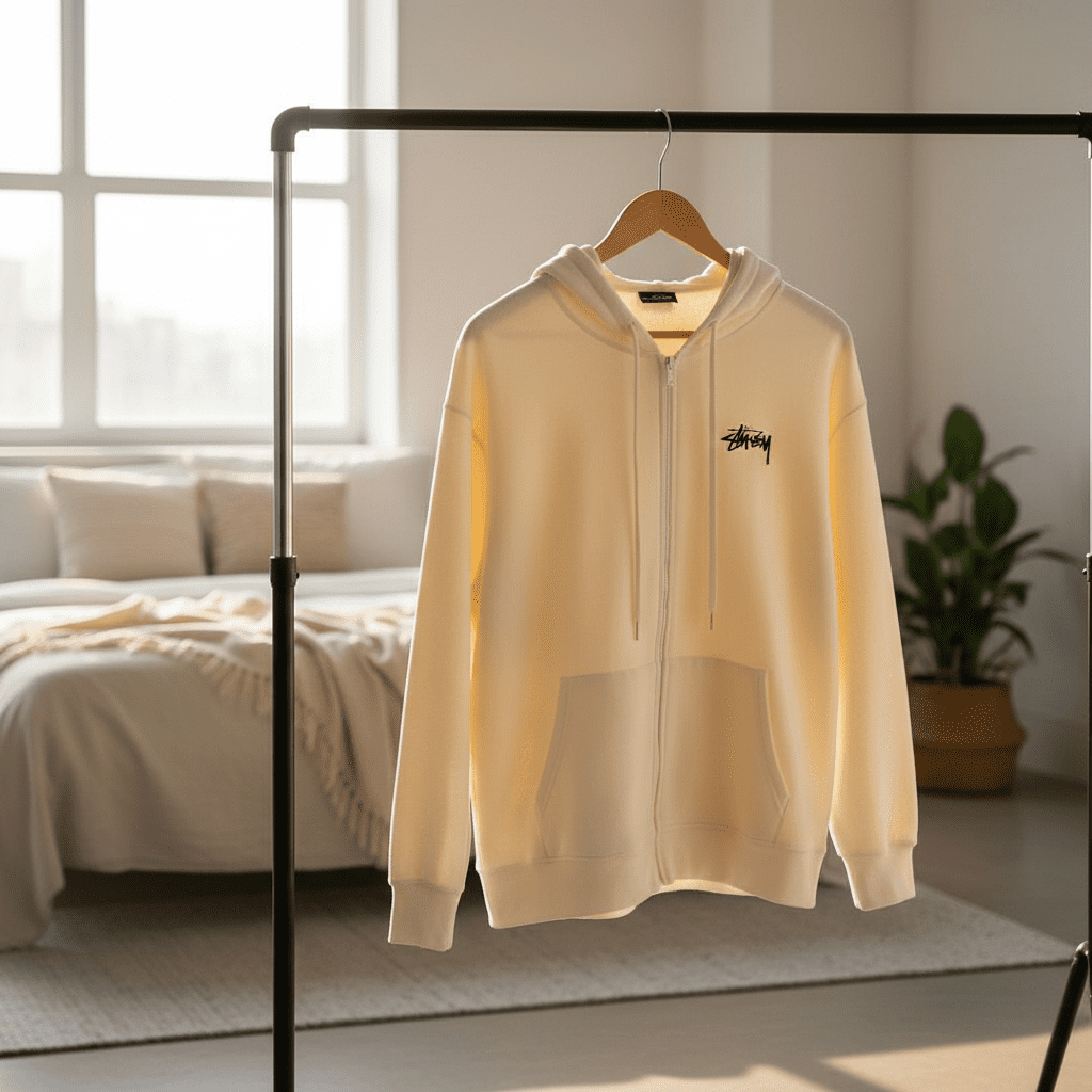 Stussy Off-White Zip Hoodie, made of premium soft breathable cotton, features logo detail on front and artistic graphic print on back. Unisex streetwear style for casual comfort and individuality.