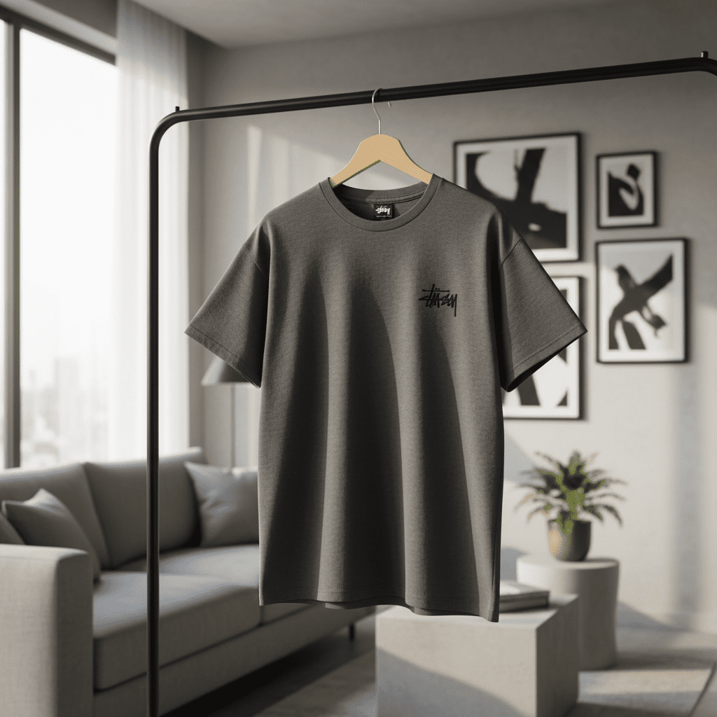 Stussy Dark Gray Street Style T-Shirt, premium cotton fabric, front graffiti logo, bold back totem print, unisex design, breathable and comfy, showing urban fashion attitude.